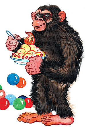 К нам приехал шимпанзе, Мы с ним ели торт «Безе», Танцевали до упаду И катались на козе.