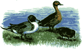 Кряк да пик за речкой тихой Из помятой мяты Шилохвость, шилохвостиха И шилохвостята. Надоело тину кушать Маленьким и взрослым, Встало солнце, вот и сушат Красненькие вёсла.