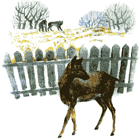 За деревней волки Воют без умолку: Сорвалась охота, Вот и выть охота. Бедная косуля, Быстрая, как пуля, Юркнула в ограду, Жизнь спасла – и рада! Бросил добрый папка Ей сенца охапку.